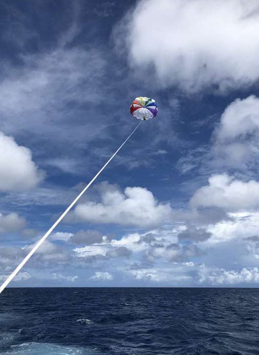 - 패러세일링은 스피드보트에 낙하산을 연결시켜 속도를 높여 하늘로 날 수 있는 경험을 해주는 것으로 넓은 하늘을 나는 기분은 이루 말할 수 없이 짜릿합니다. 괌의 멋진 바다를 하늘에서 볼 수 있습니다.