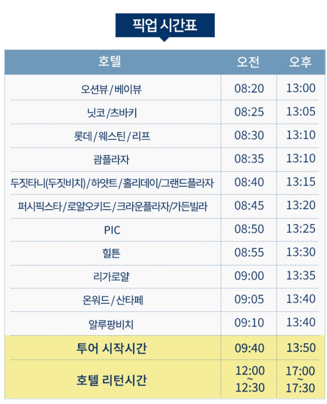 - 무료로 왕복 픽업 됩니다. (픽업 시간표에 나와있는 호텔에 한하여, 시간표 참고해주세요)