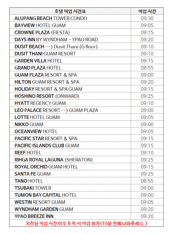 ※ GRAND PLAZA / GUAM PLAZA / TANO 호텔의 경우 3월 31일까지 아래 스케줄로 운영됩니다.