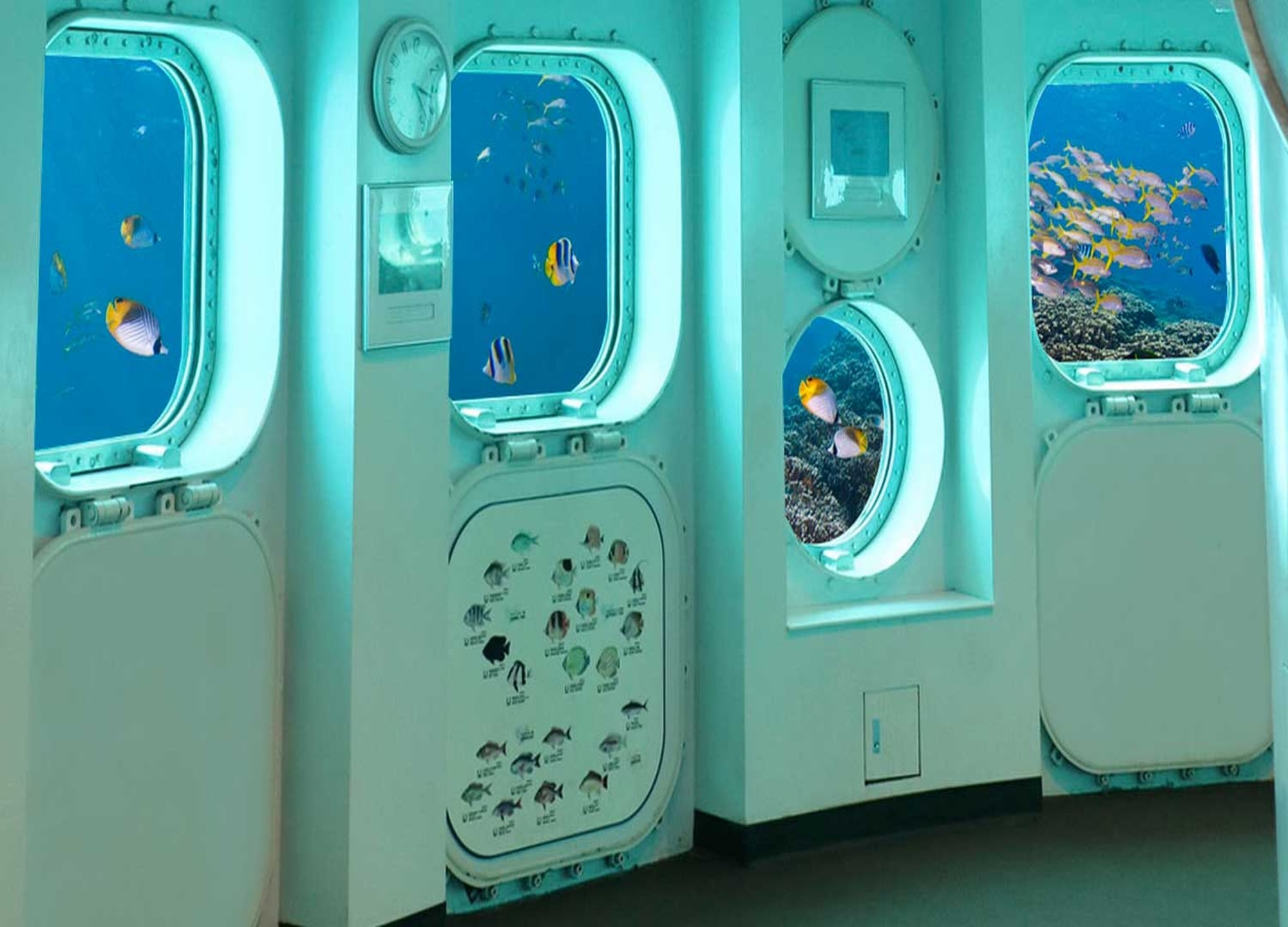 내부로 들어가면 24개의 창을 통해 맑고 푸른 바다, 다양한 물고기들을 만날 수 있어요.