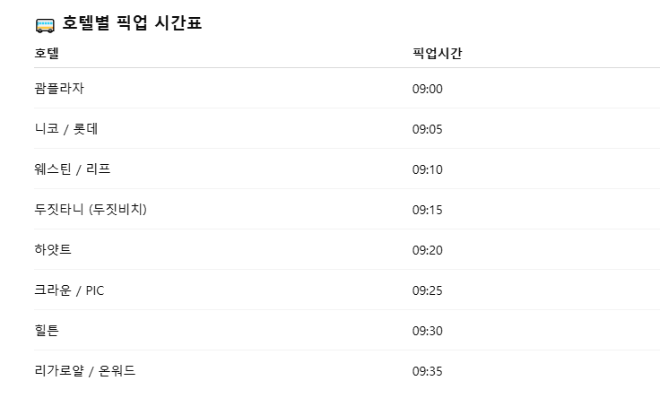 게스트하우스 또는 픽업 불가 숙소는 인근 호텔로 지정 안내될 수 있습니다.