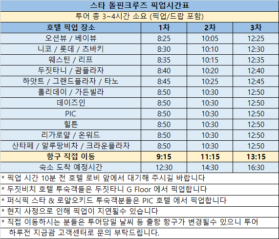 예약 시 돌핀크루즈 진행 원하시는 날짜와 타임 선택 하신 후 요청 사항에 별빛투어 진행 원하시는 날짜 / 타임 / 픽업 호텔 기재 부탁드립니다.