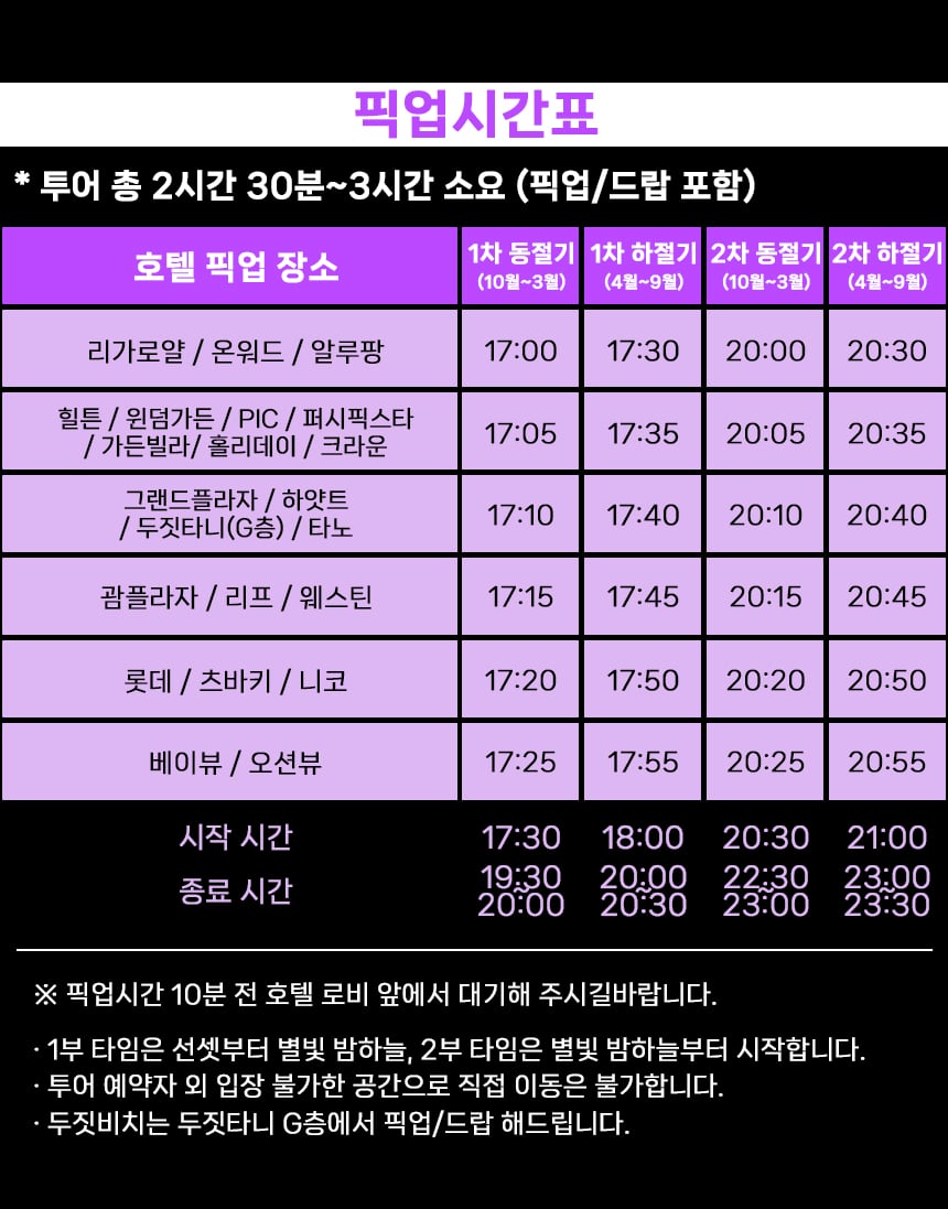 - 투어 전 현지업체에서 별도의 연락을 드리지 않으니, 당일 픽업시간 10분 전 호텔 로비 입구에서 대기해주시기 바랍니다.