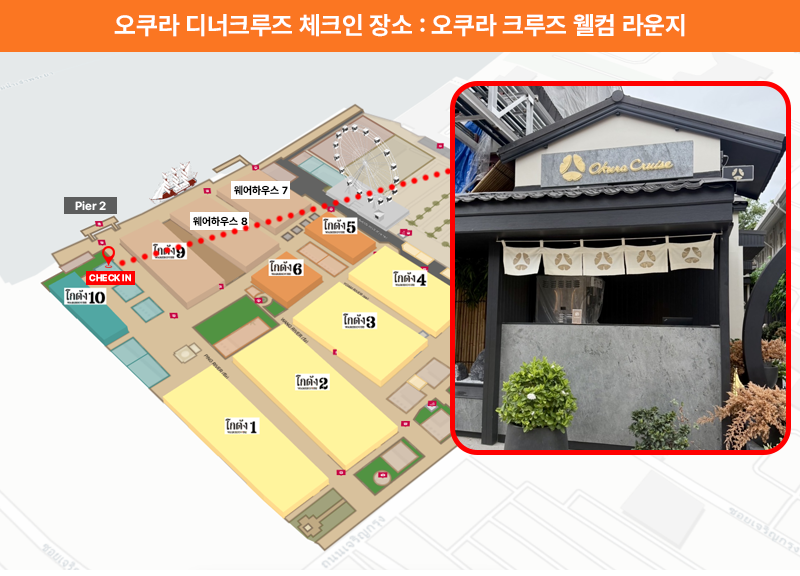 체크인 카운터 : 오쿠라 크루즈 웰컴 라운지 (아시아티크 Siam Tea Room 레스토랑 옆 위치)