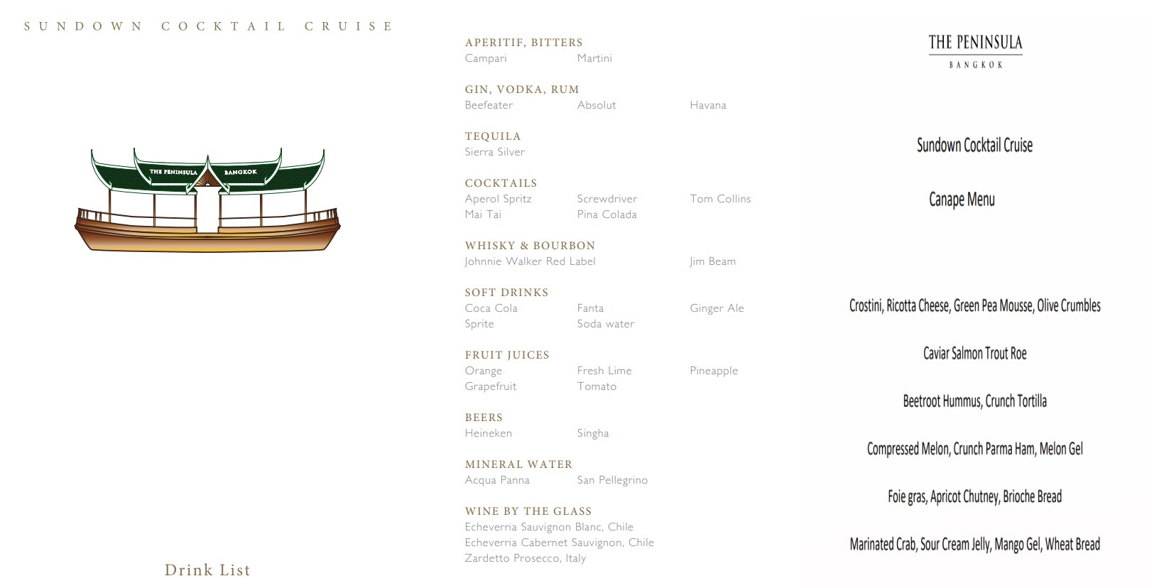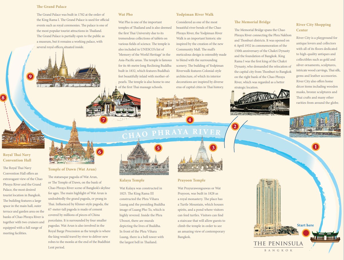왕궁과 왓아룬 등의 차오프라야 수로를 따라 방콕의 명소를 즐기며 페닌슐라만이 제공할 수 있는 선다운 크루즈에서 해가 지는 풍경을 감상할 수 있어요.