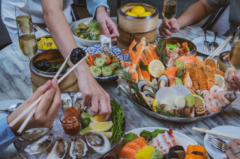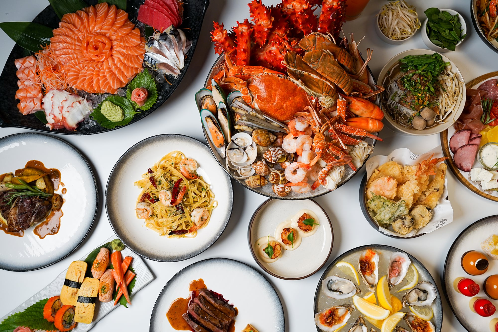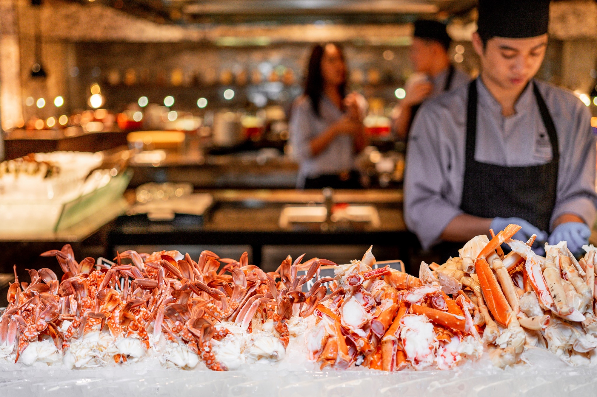 셰프가 추천하는 시그니처 요리, 신선한 해산물과 현지 인기 요리를 포함한 뷔페 라인의 다양한 세계 각국의 요리를 제공합니다.
