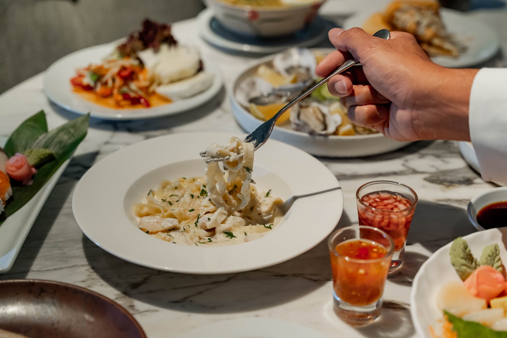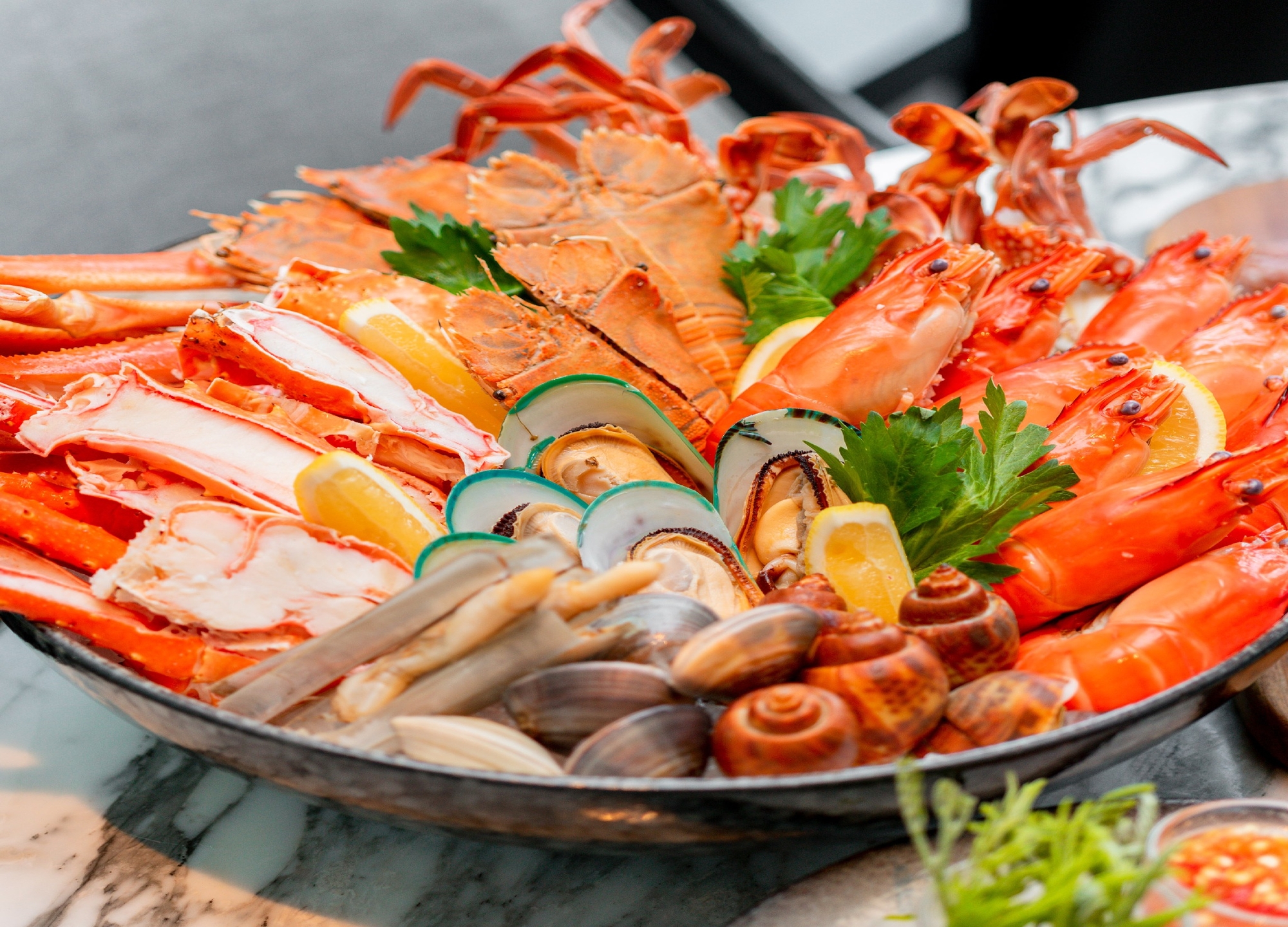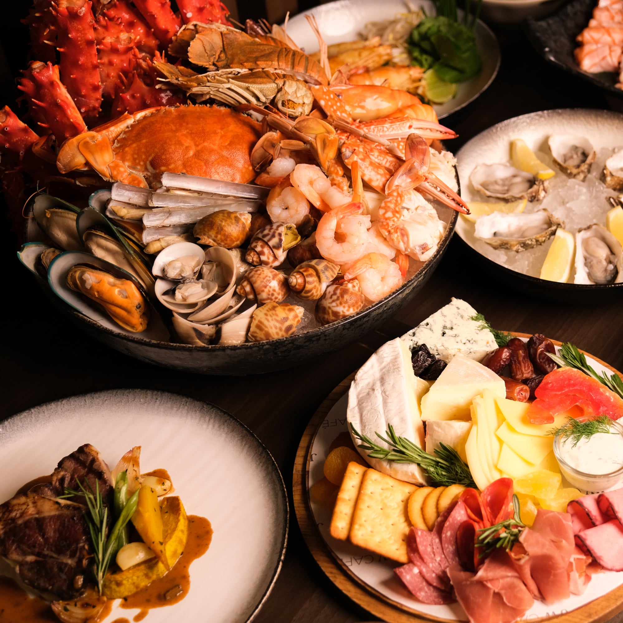 셰프가 추천하는 시그니처 요리, 신선한 해산물과 현지 인기 요리를 포함한 뷔페 라인의 다양한 세계 각국의 요리를 제공합니다.