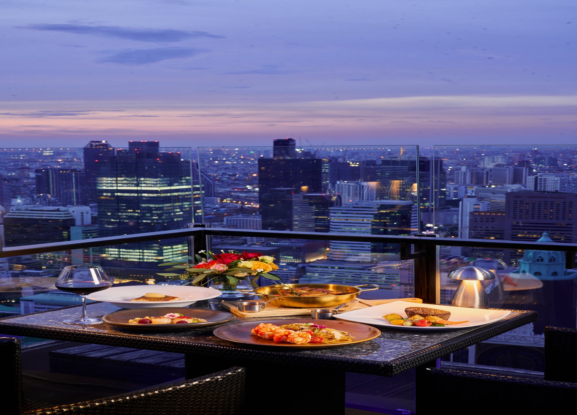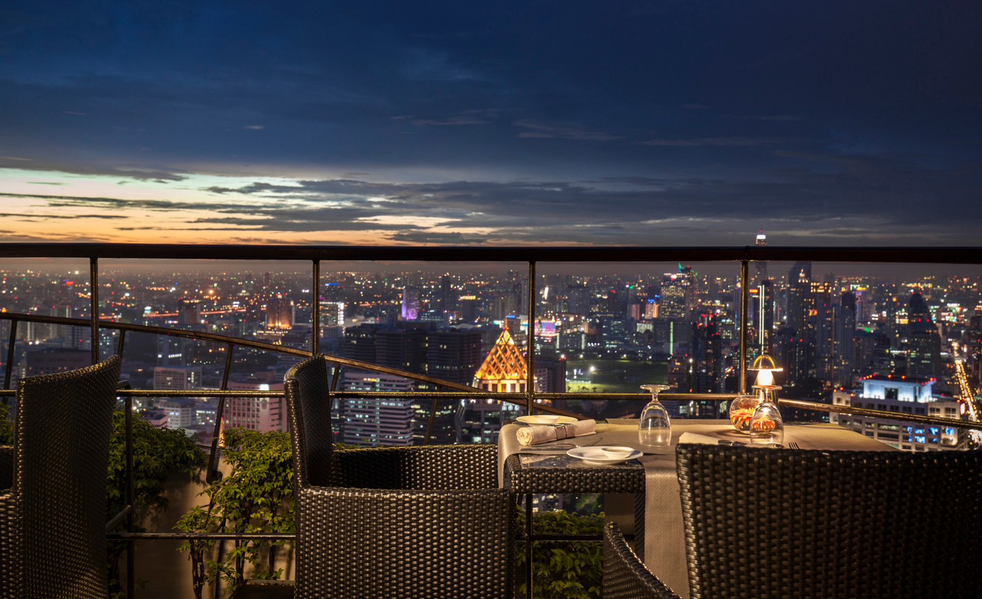 - 방콕의 빛나는 도시 경관이 내려다보이는 광활한 스카이라인을 바라보며 음식을 즐겨보세요.