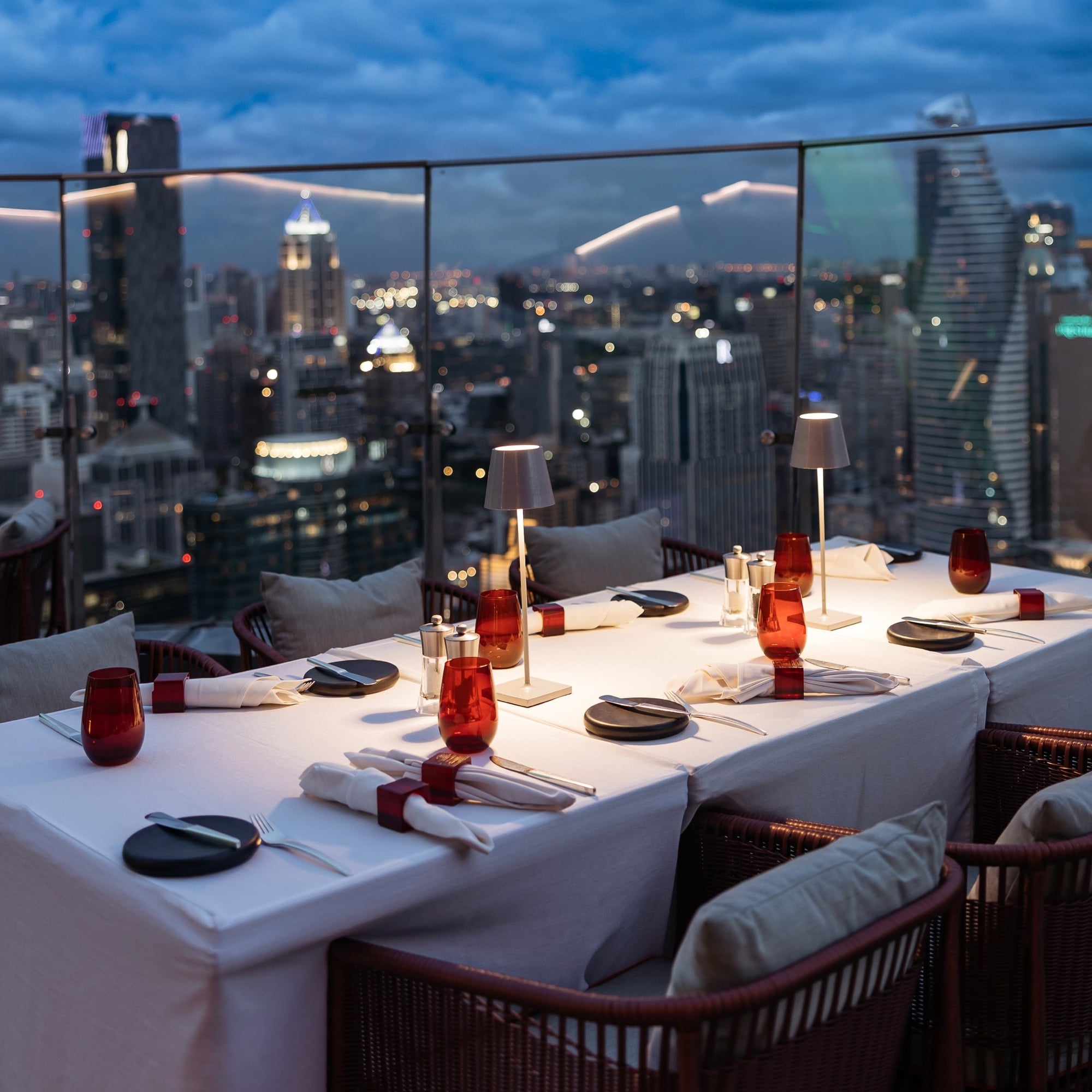 - 전망이 보이는 세련된 래드 스카이 바 (Red Sky Bar) 는 방콕에서 가장 호평받는 루프탑 바 중 하나입니다. 이곳에서는 도시의 전경을 감상하며 로맨틱 디너를 즐길 수 있습니다.