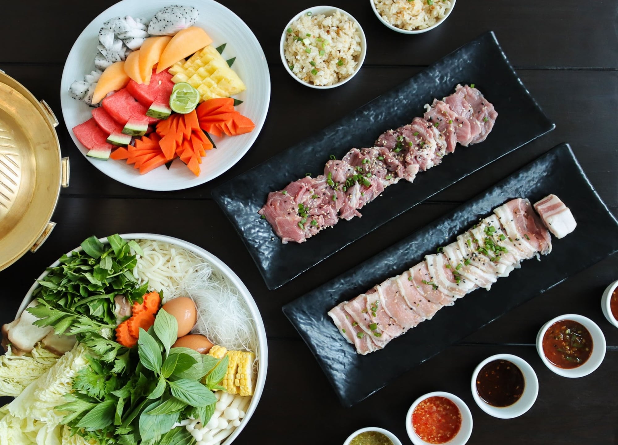 얇게 썬 흑돼지, 얇게 썬 호주산 와규, 베이컨, 각종 야채, 계란, 당면, 우동, 마늘 볶음밥, 5종 소스