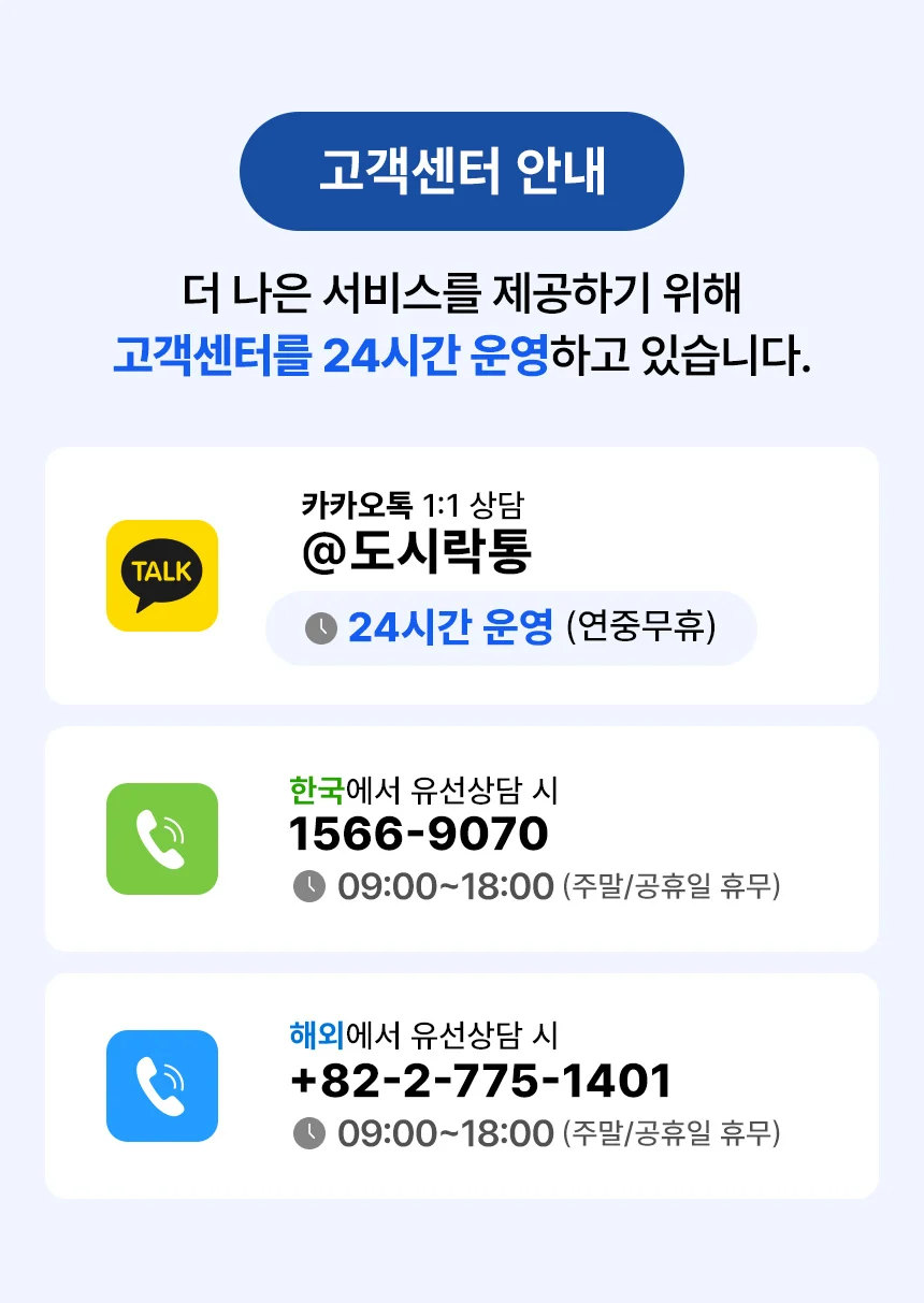 - 서울고객센터 : 09:00 ~ 18:00 (12:00~13:00, 주말 및 공휴일 불가)