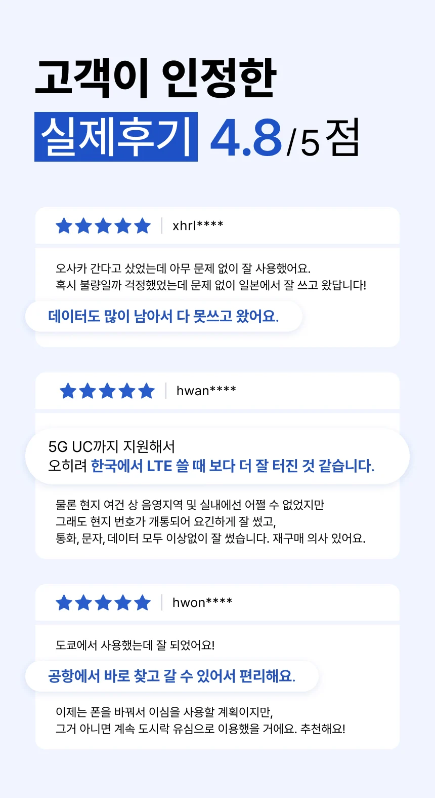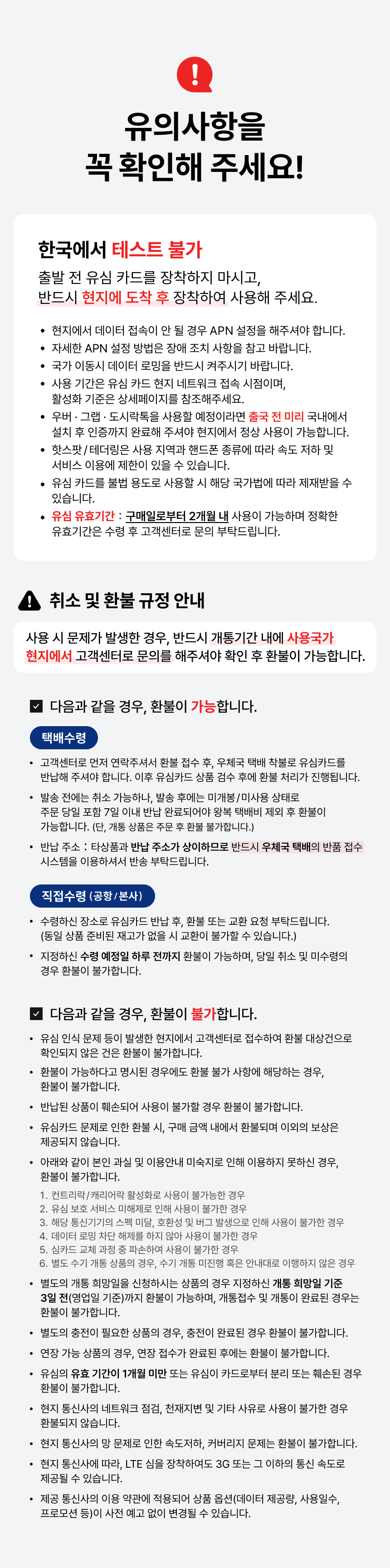 - 유심카드에 문제가 있어 환불될 경우, 구매금액 내에서만 환불 처리되며 그 외 별도의 보상은 제공되지 않습니다.