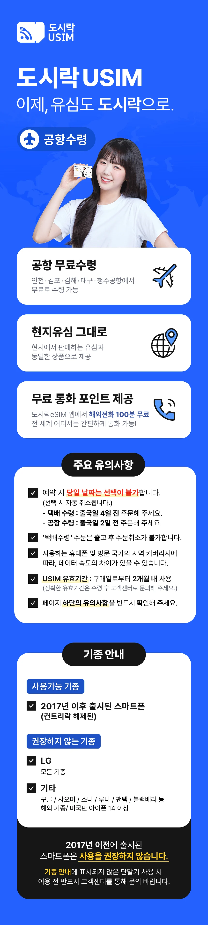 - 출국 전 이용하실 휴대폰의 ‘컨트리 락(통신사 잠금)’ 해제 여부를 꼭 확인해 주세요.