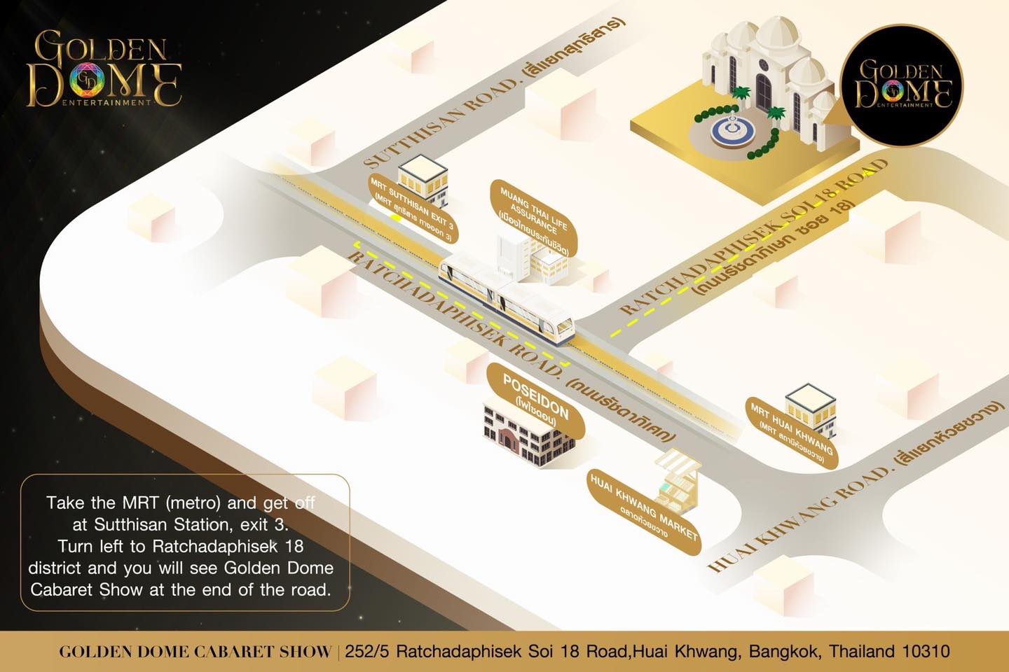 (태국어 주소: 252, 5 ซอย รัชดาภิเษก 18 แขวง ห้วยขวาง เขตห้วยขวาง กรุงเทพมหานคร 10310) - Bolt 혹은 Grab 이용시목적지를 'Golden Dome Cabaret Show' 으로 입력해 주세요.