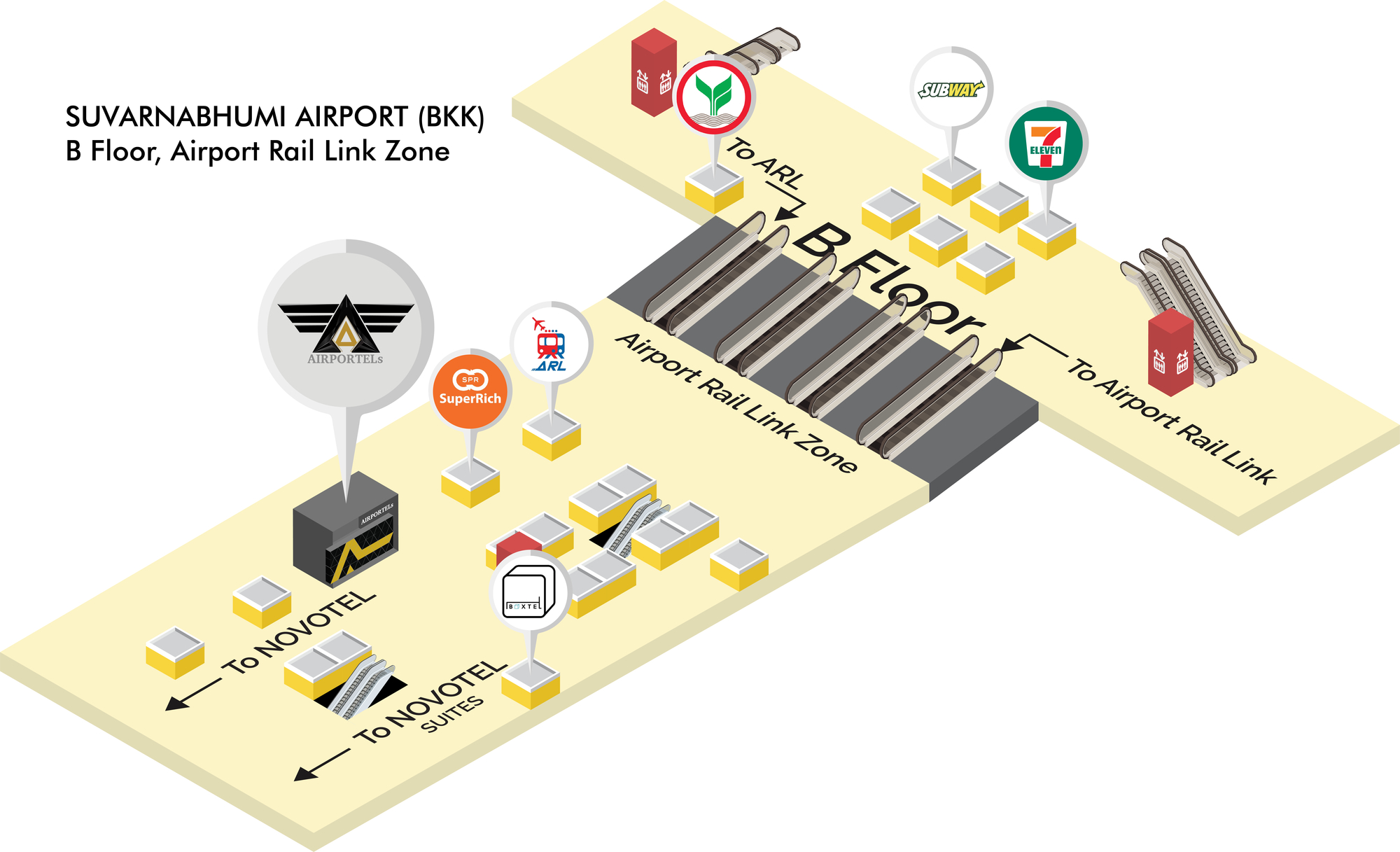 - 수완나품 공항(Suvarnabhumi Airport)에서 에어포텔 부스 찾아가기수완나품 공항 B층, Airport Rail Link 존에 있습니다.