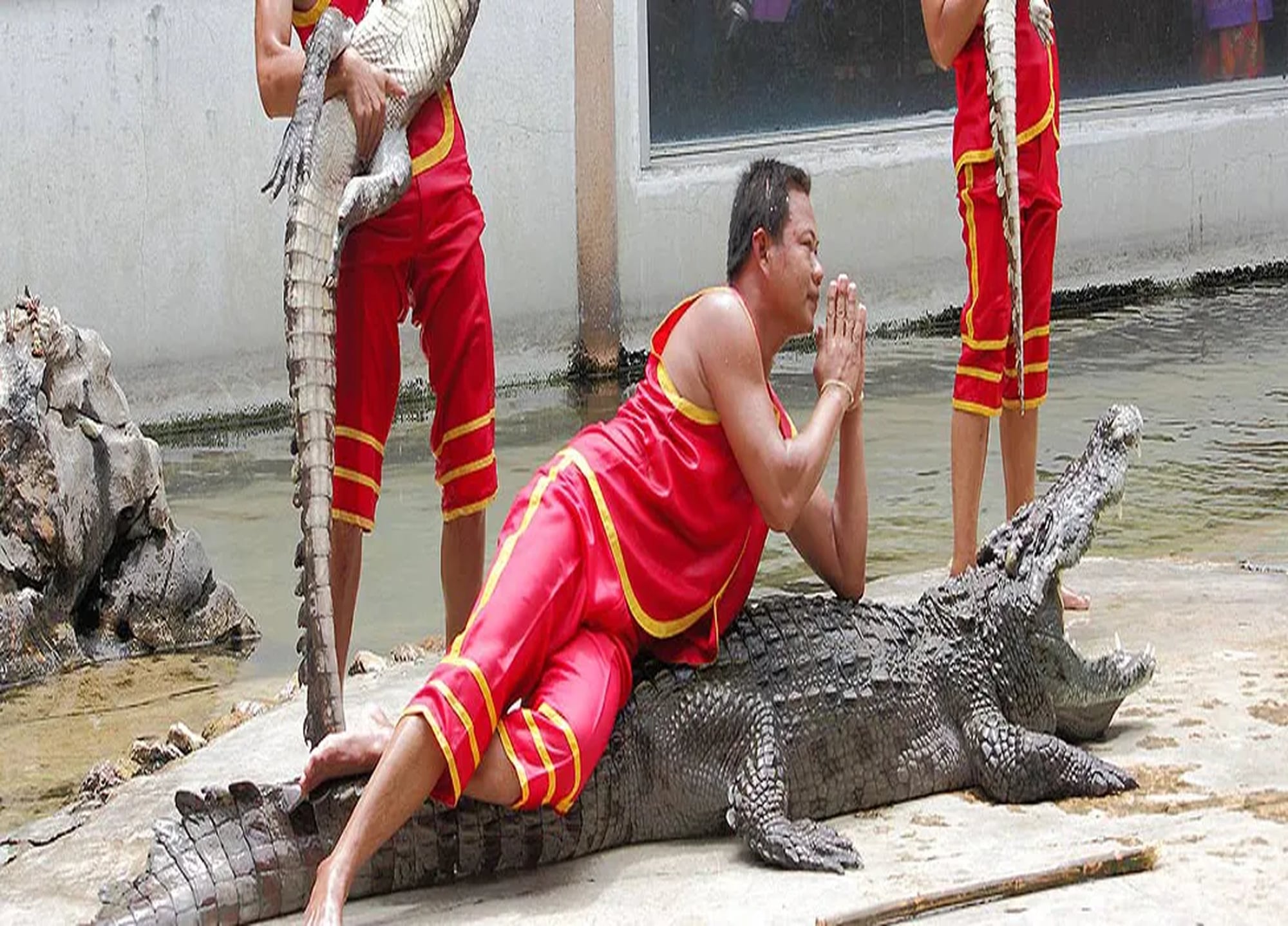 - 사뭇프라칸 악어농장은 방콕 시내에서 차량으로 약 30~40분(10km 내외) 거리에 위치한 동남아시아 최대 규모의 악어농장으로, 약 10만 마리 이상의 악어를 보유하고 있으며 민물악어, 해수악어, 샴악어 등 다양한 종류의 악어와 함께 소동물원, 공룡 박물관까지 갖춘 복합 체험 공간입니다. 특히 훈련된 조련사가 악어와 직접 레슬링을 하거나 벌어진 악어의 턱 안에 머리를 넣는 등 아찔하고 대담한 퍼포먼스를 선보이는 악어쇼는 이곳의 하이라이트로, 태국 여행 중 이색적인 경험을 원하는 분들께 강력히 추천드립니다.