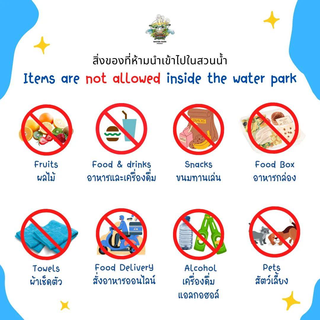 과일, 음료, 음식, 과자, 도시락, 주류, 개인 타월은 워터파크 내 반입 불가