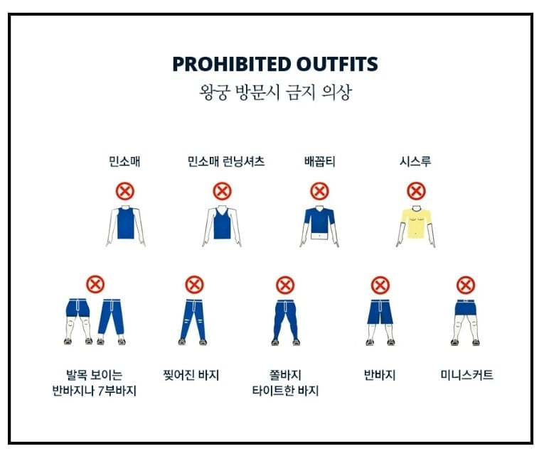 - 왕궁 입장 불가한 복장으로 오셔서 현장에서 입장 거부될 경우 책임지지 않습니다. (현장 대여 불가능)