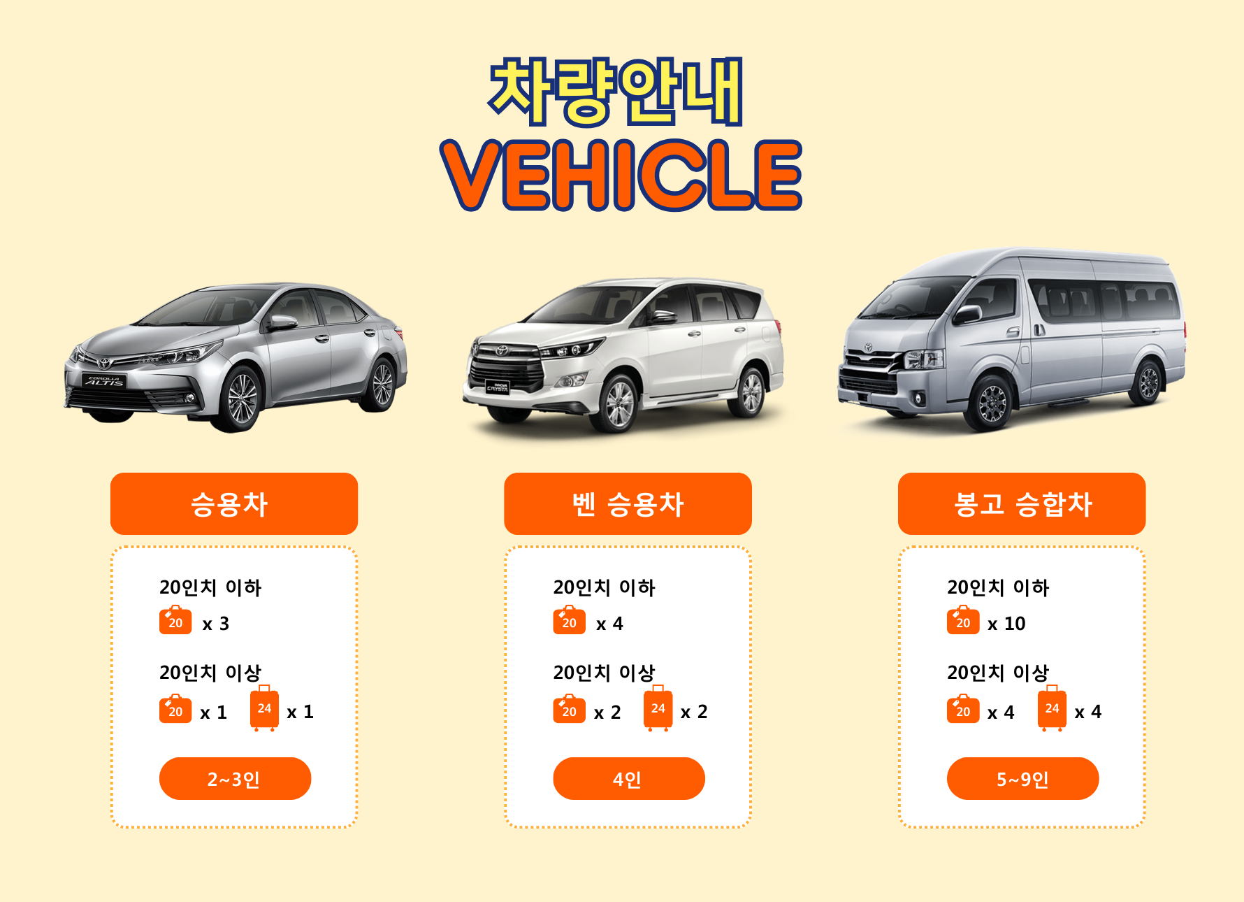 2~3인 : 승용차 / 4인 : SUV / 5인 이상 : 밴 승합차