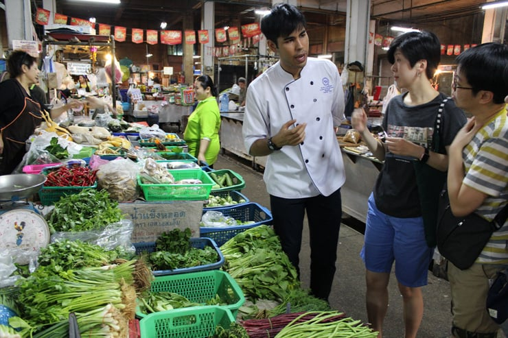 Bang Rak 아침 시장으로 이동하여 강사와 함께 태국 과일과 채소, 향료의 사용법 숙지