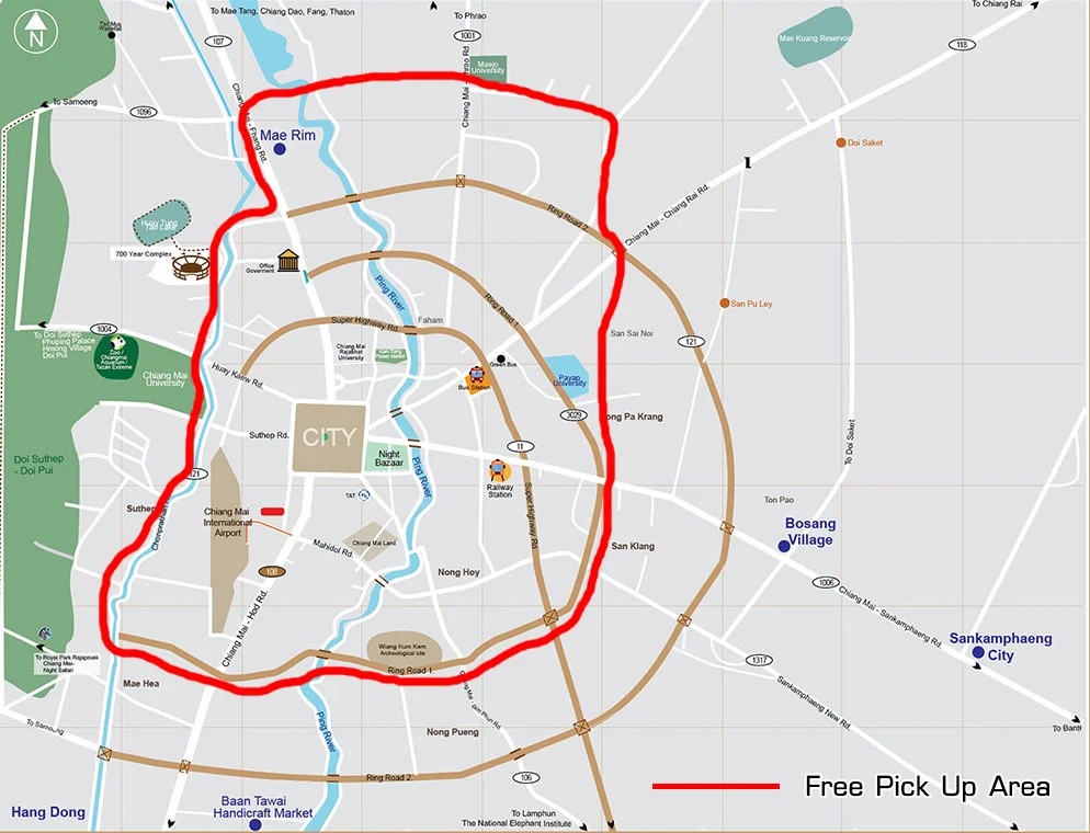 시내 호텔은 무료 픽업이 가능하나 외곽 지역의 호텔은 추가 픽업비(1,000바트)가 발생하거나 가능하지 않을 수도 있습니다.
