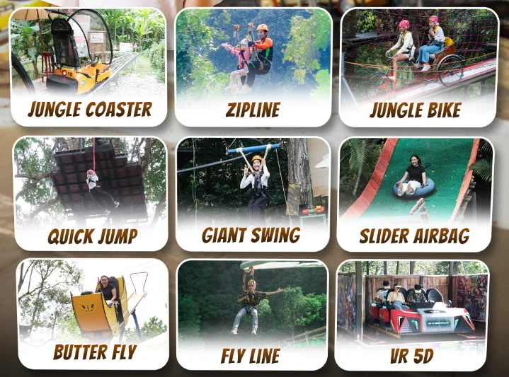 - 짚라인·퀵 점프·자이언트 스윙은 만 7세 이상, 정글 코스터는 만 8세 이상부터 이용 가능하며 반드시 보호자 동반이 필요합니다.