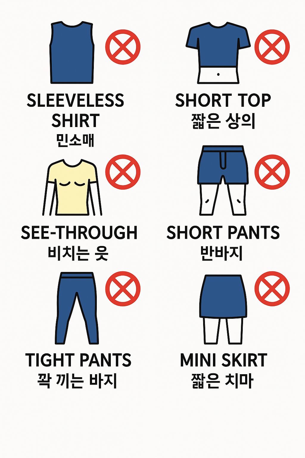 사원에서는 미니스커트, 반바지, 찢어진 청바지, 민소매, 슬리퍼 착용하시면 입장이 불가합니다.