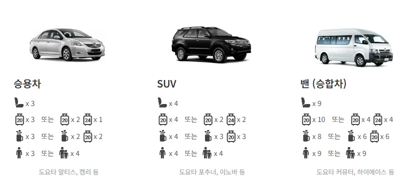 4인 : SUV (20인치 캐리어 4개 또는 20인치 캐리어 2개+24인치 캐리어 2개)