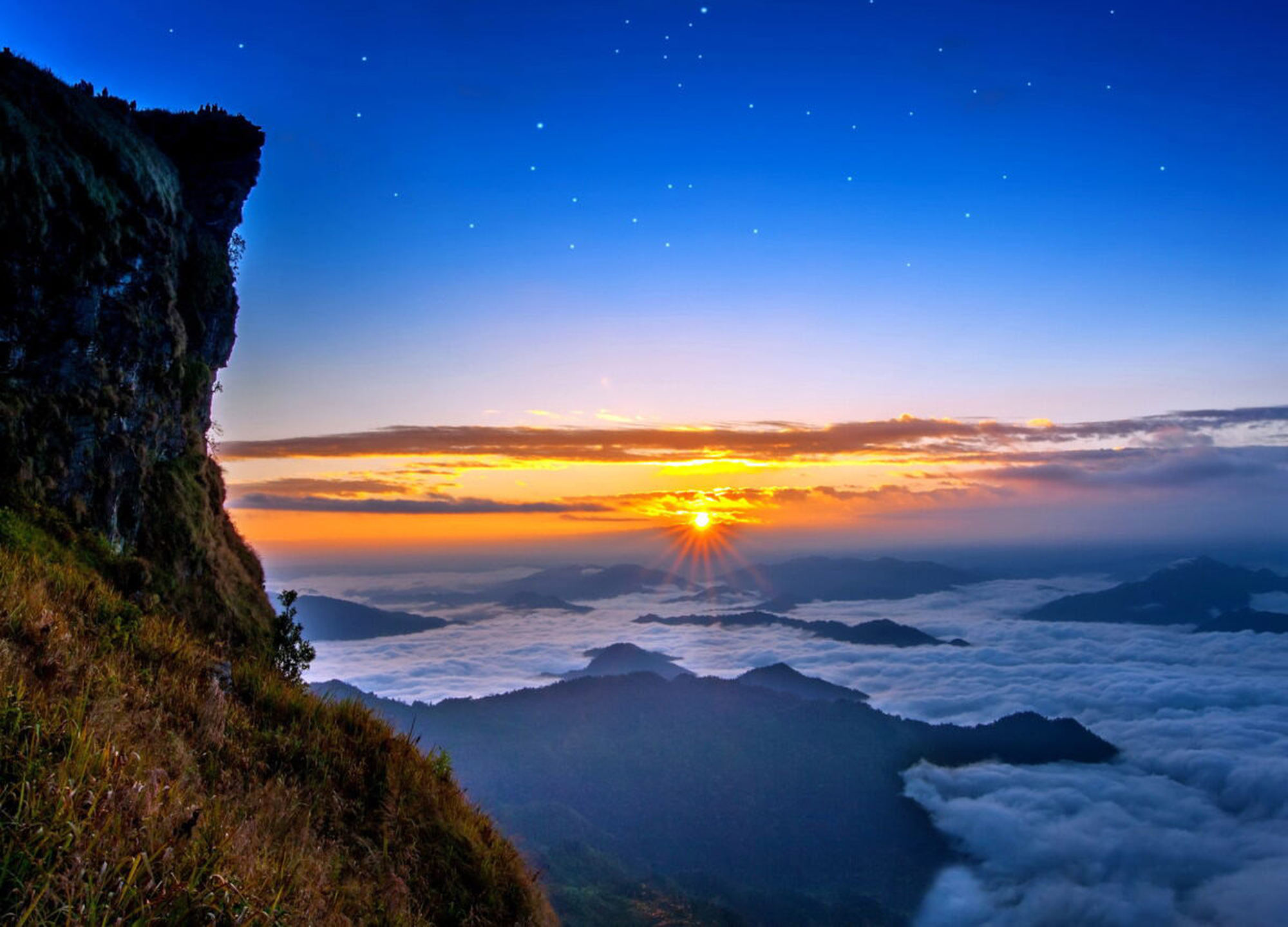 태국 북부 최고의 장면인 라오스 국경을 따라 펼쳐진 절벽 능선 위에서 보는 일출 감상
