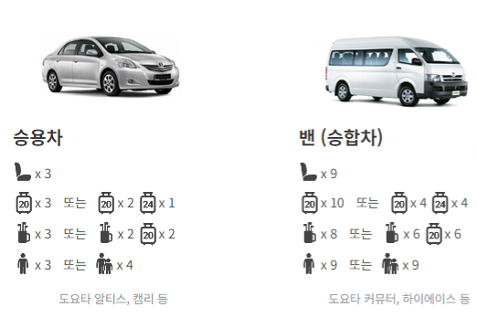 4인 이상 : 밴 승합차 (20인치 캐리어 10개 또는 20인치 캐리어 4개+24인치 캐리어 4개)