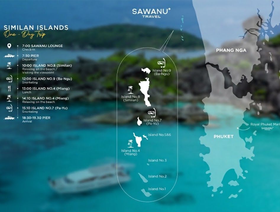 시밀란 군도는 총 9개의 섬으로 이루어져 있으며, 당일 날씨와 파도 상황에 따라 방문하는 섬이 변경될 수 있습니다.