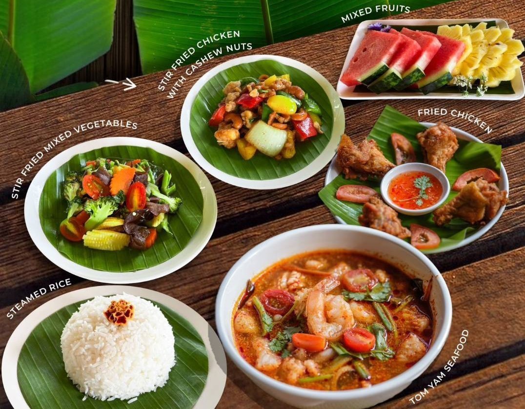똠얌 씨푸드 / 치킨 캐슈넛 볶음 / 후라이드 치킨 / 야채 볶음 / 밥 / 제철 과일 / 물 이 제공됩니다.