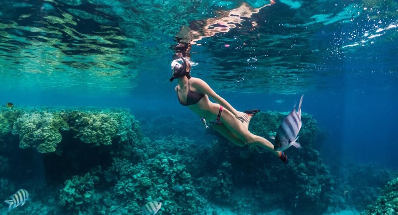 워터 액티비티 : 스노쿨링, 패들보드, 투명 카약, 워터 슬라이드, 바다 낚시 등 다양한 해양 스포츠 체험