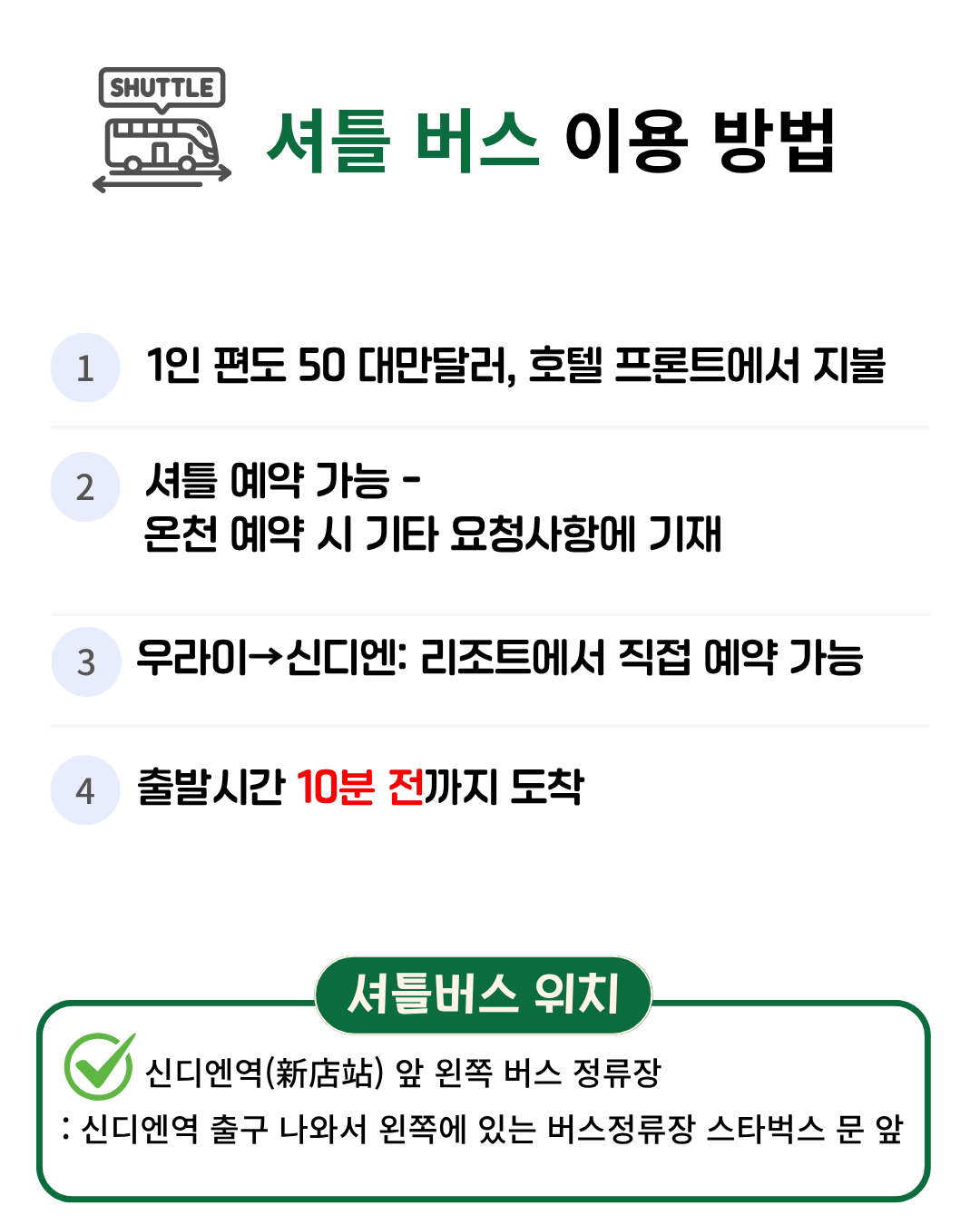셔틀 예약 가능 - 온천 예약시 기타 요청사항에 예약 원하시는 시간을 남겨주세요.