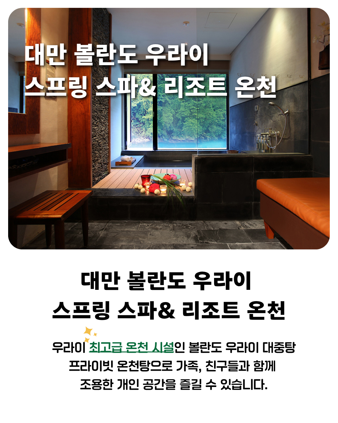 - 본 상품은 ㈜토토부킹에서 판매 대행하고 실제 운영은 "Volando Urai Spring Spa & Resort Wulai" 에서 주관합니다.