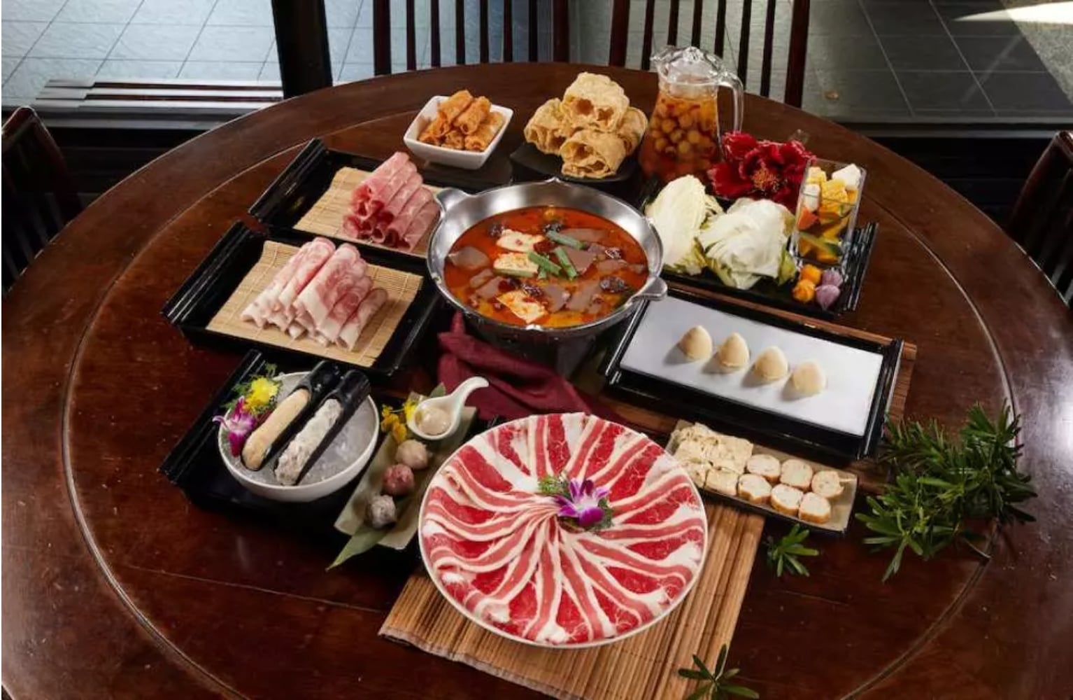 크리미 두부 전골 & 홍탕 전골 두가지 맛 중 택1, 우삼겹, 삼겹살, 돼지 목살, 시그니처 미트볼, 두부 껍질, 야채모듬 플레이트(계절), 요우티아오, 콩말이, 국화 음료 - 추가정보