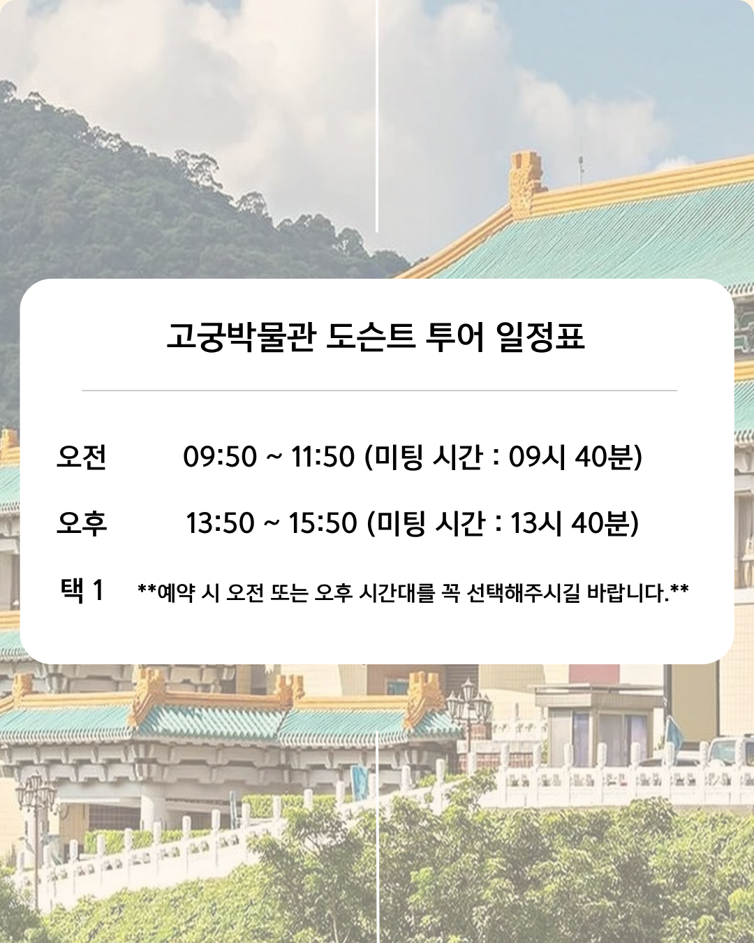 정부 공식 자격증이 있는 전문 한국어 가능 해설원과 함께하는 대만 고궁 국립 박물관 도슨트 투어 입니다.