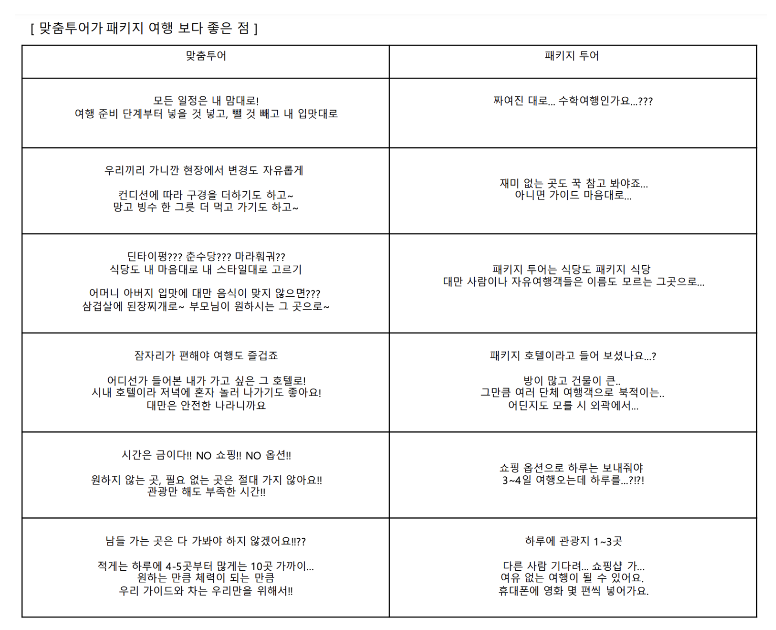 하루는 쇼핑하고 하루는 옵션관광으로 길지 않은 시간을 버리면서 정해진 일정대로 따라 다니시는 그런 여행만 하실건가요? - 맞춤투어가 단체 패키지투어보다 비싸 보일 수 있습니다. 하지만 몇 가지만 비교보세요