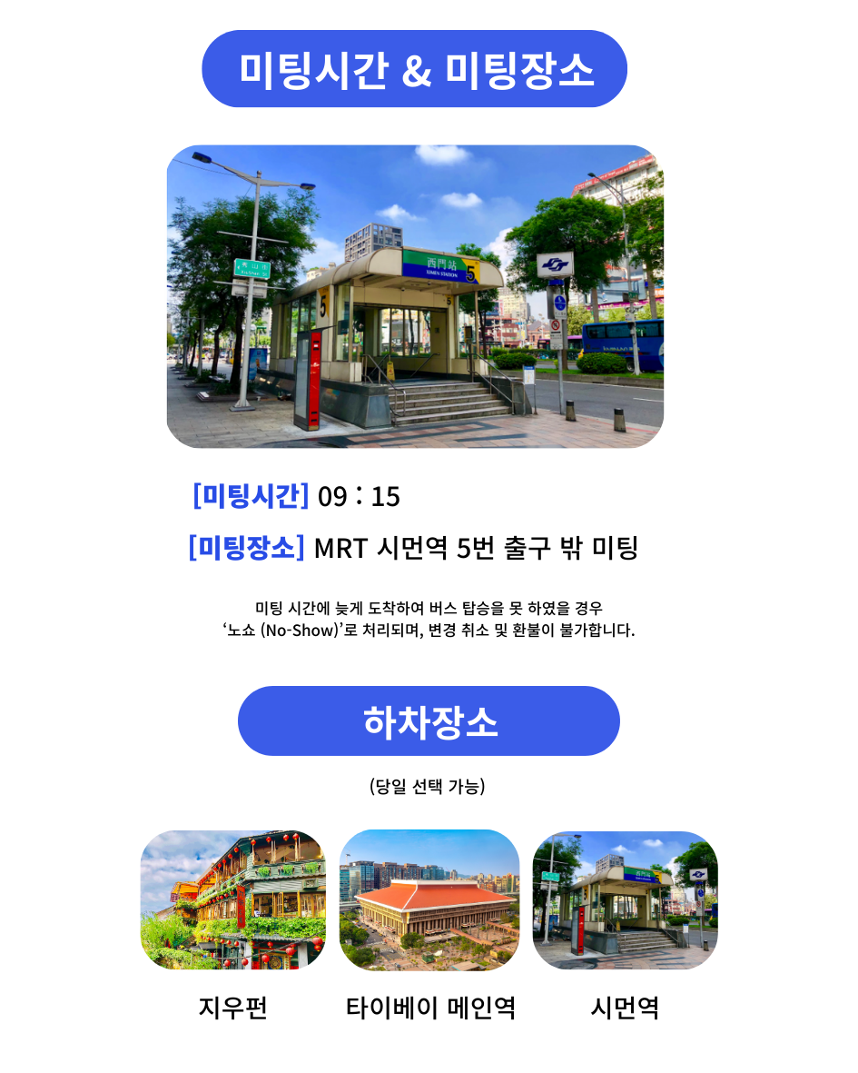 출발 시간 10분 전까지 미리 도착해주시기 바랍니다. 지각 또는 노쇼(No-show)의 경우 환불되지 않습니다.