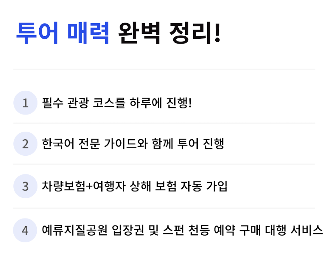 하차 장소 순서 또한 당일 교통상황에 따라 달라질 수 있습니다.해당 업체에서 투어 출발일 하루 전 오후 18시 이후 미팅 장소 및 배정 가이드 정보를 메일로 발송해드립니다. 별도의 개별 연락을 드리지 않으니, 반드시 이메일을 확인하셔서 자세한 여행 정보를 받아보시기 바랍니다.