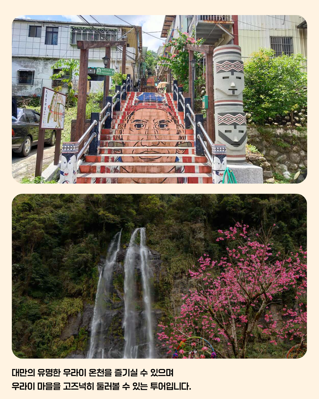 - 대만에 유명한 우라이 온천을 즐기실 수 있으며 우라이 마을을 고즈넉히 둘러볼 수 있는 투어입니다.