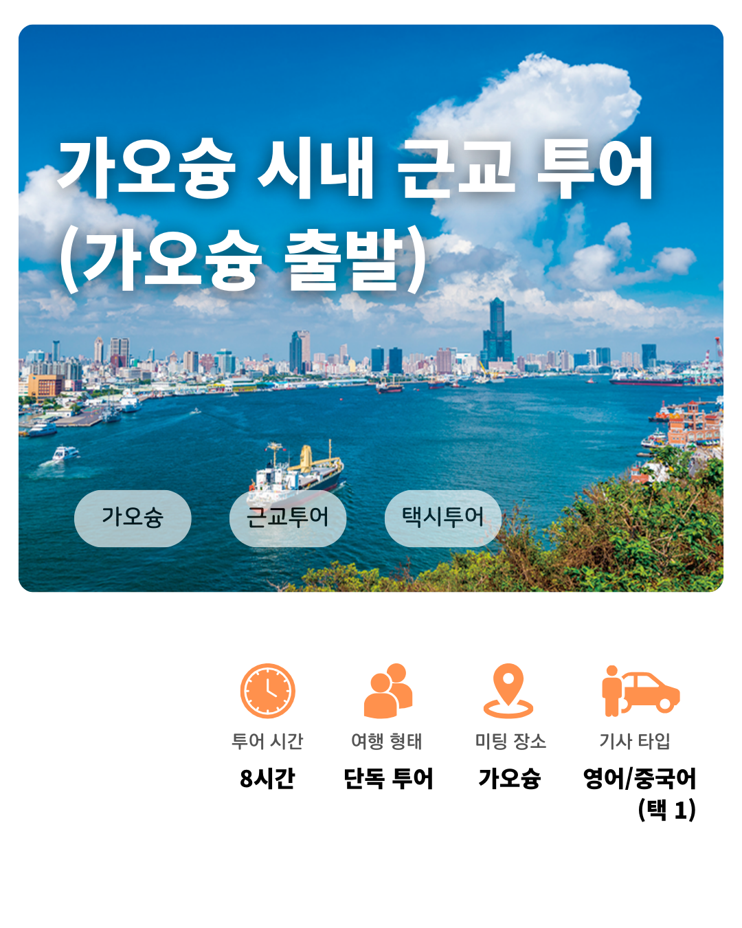 출발 장소가 가오슝 시내가 아닌 경우 추가비용이 있을 수 있습니다.