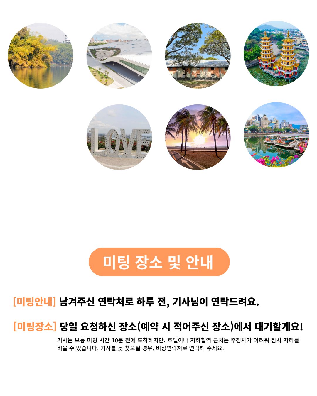미팅 장소가 2곳 이상인 경우 추가 비용이 발생하거나, 위치에 따라 한 곳에서만 미팅이 가능할 수 있으니 예약시 미리 알려주시길 바랍니다. - 픽업 장소에 따른 추가비용 안내