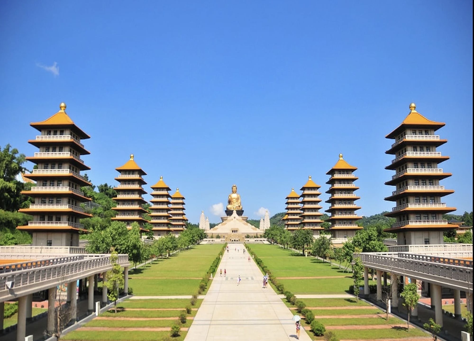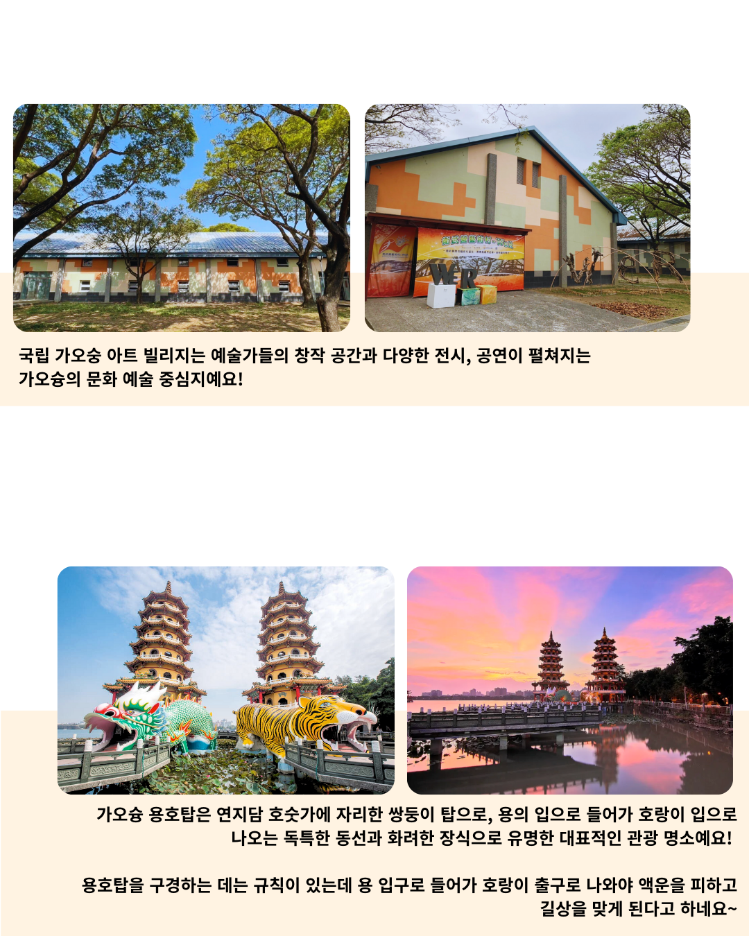 가오슝 용호탑은 연지담 호숫가에 자리한 쌍둥이 탑으로, 용의 입으로 들어가 호랑이 입으로