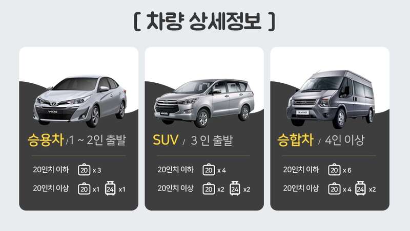 차량은 성인인원수 기준으로 제공됩니다. 차량 사이즈를 업그레이드는 사전에 신청하시면됩니다.