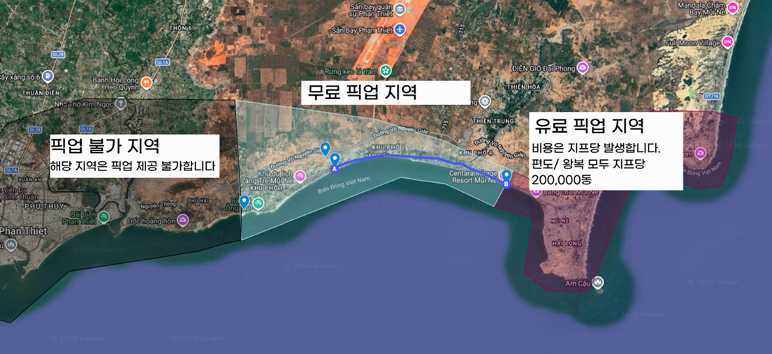 이미지 좌측 픽업 불가 지점은 클리프 리조트 (The Cliff Resort & Residences, Mui Ne)에서 일괄적으로 픽업 제공됩니다.