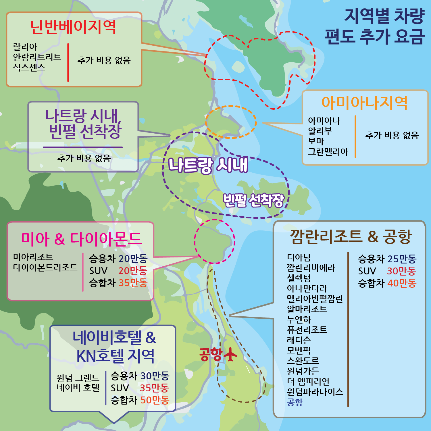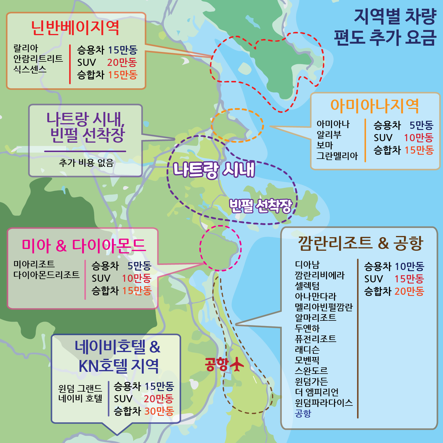(3) 캄란 & 공항인근 지역 : 승용차 25만동 / SUV 30만동 / 승합차 40만동