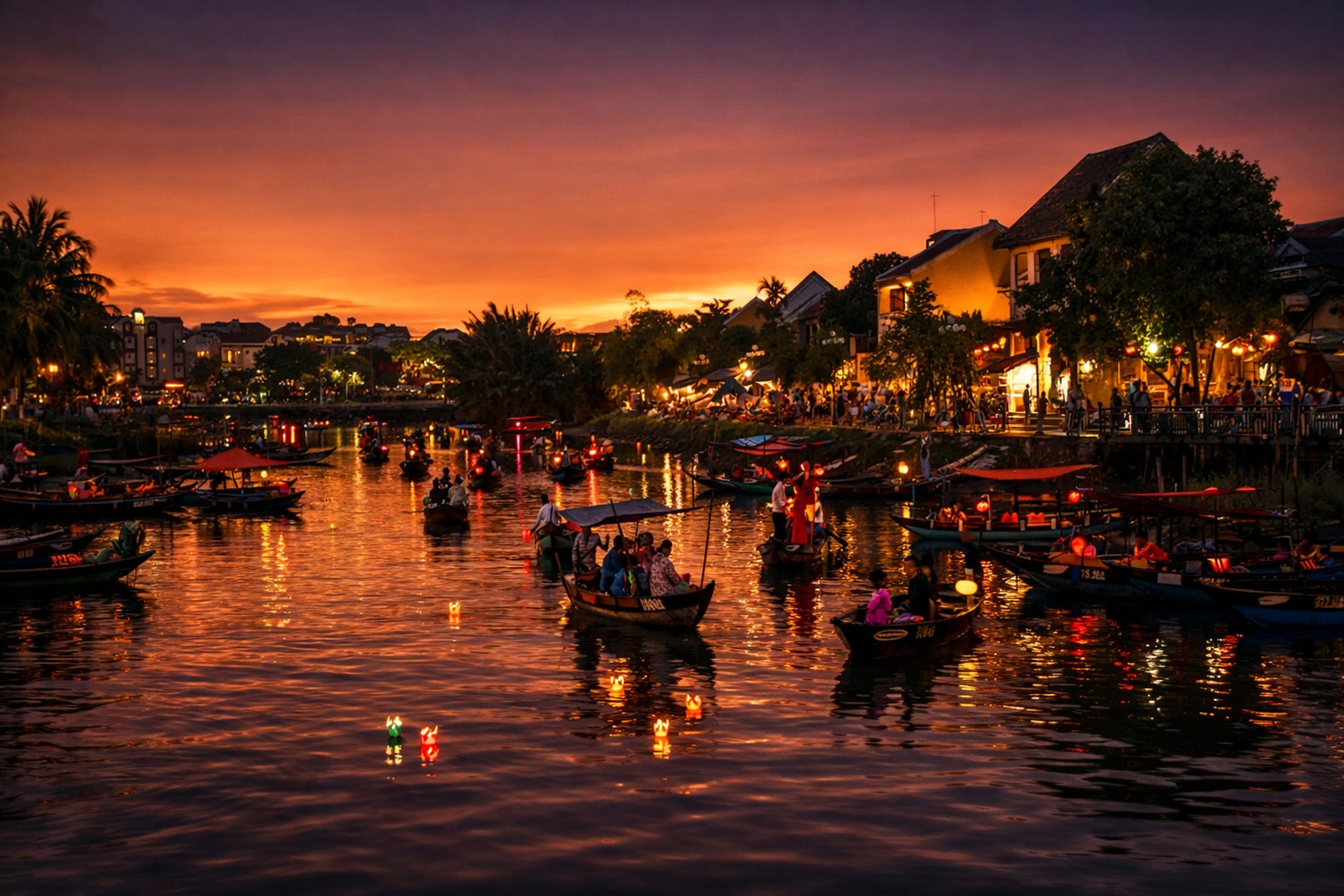 '호이안 야경'을 즐기며 강물에 띄우는 소원초는 호이안 여행의 운치를 더합니다.