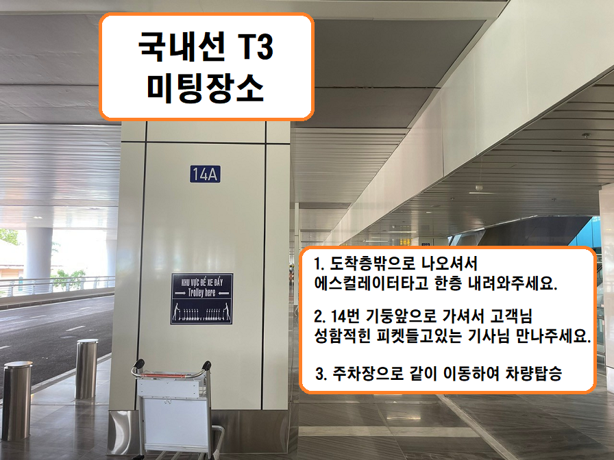 출구 나오셔서 건물밖 A-14번 기둥에서 고객님 성함적힌 피켓들고있는 기사와 미팅후 주차장으로 같이 이동해주세요.