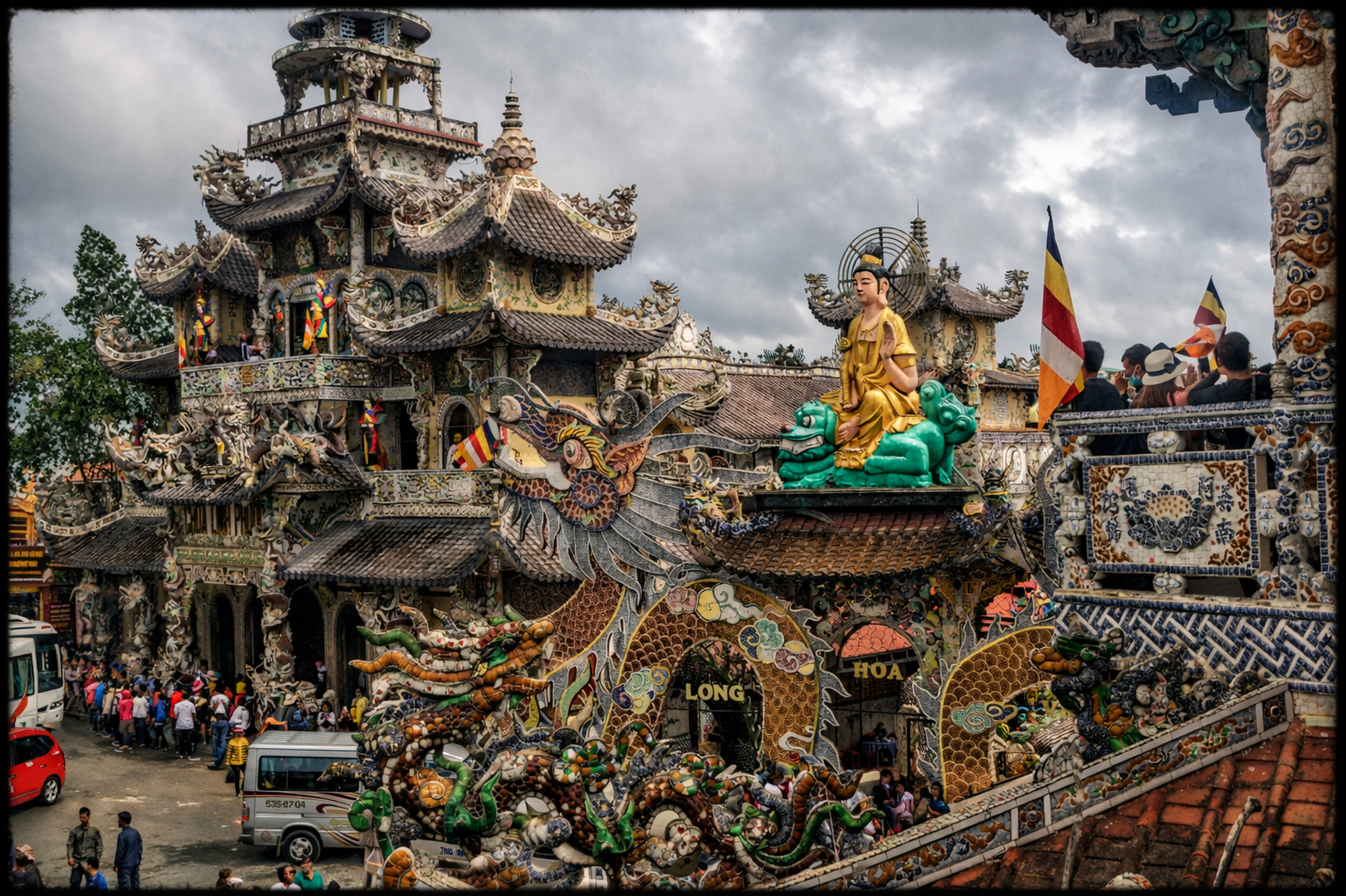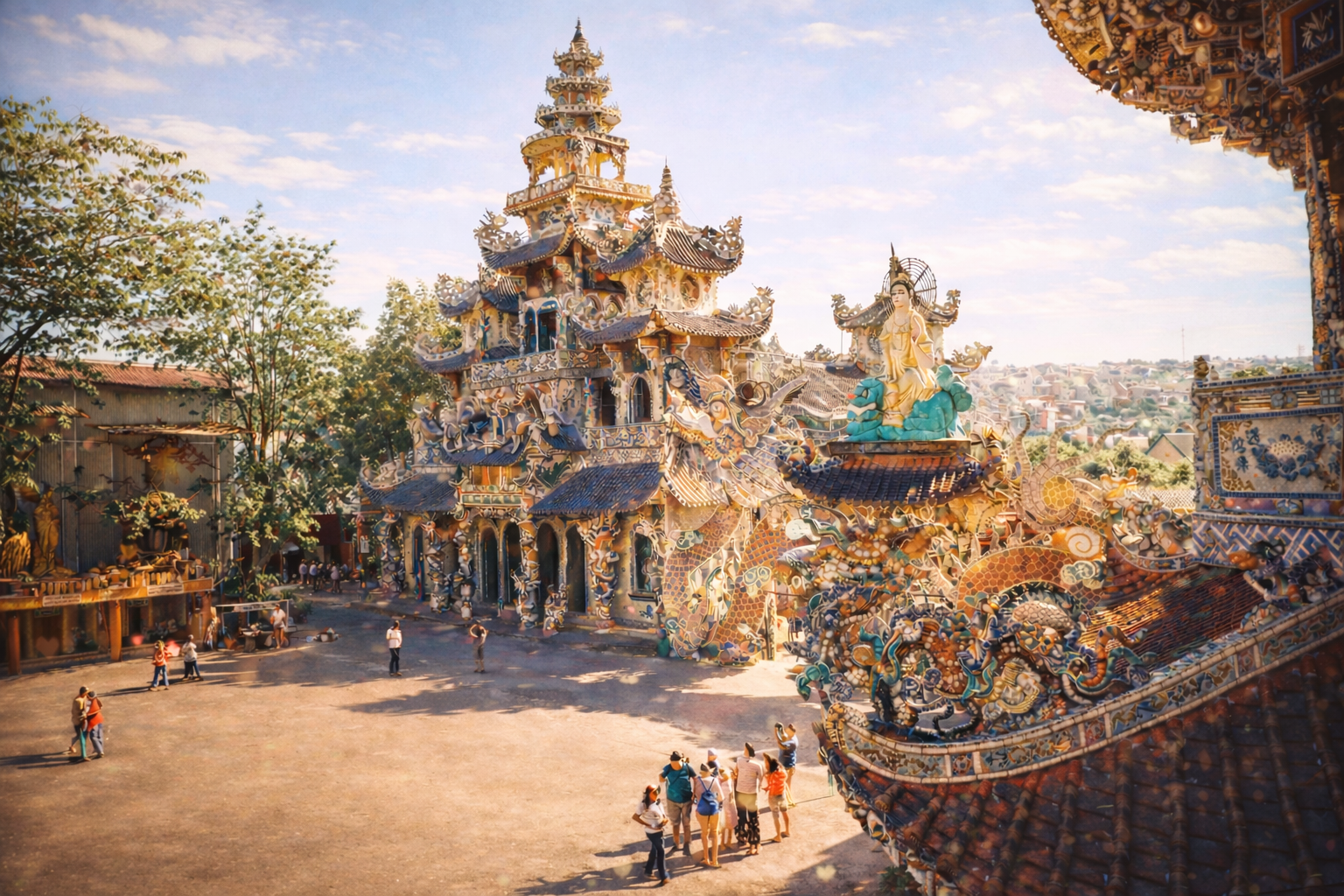 린푸억 사원은 깨진 도자기 조각으로 장식된 사원으로 베트남에서 가장 높은 종탑이 있습니다.